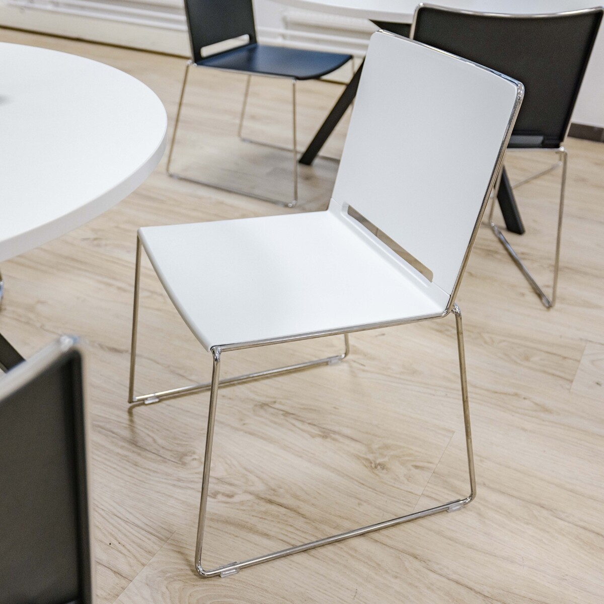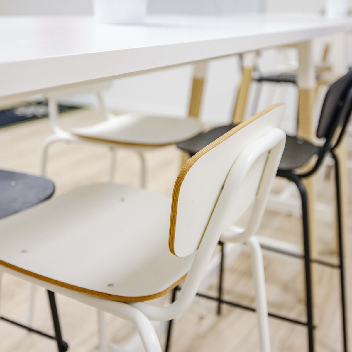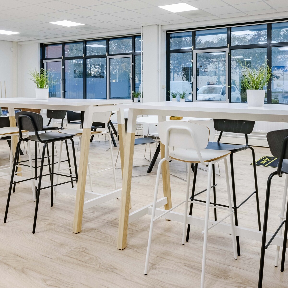 Stylist Ricky: "Ik ben altijd onwijs blij wanneer ik een project van A tot Z mag begeleiden. Het project van IMI Aero-Dynamiek was er zo eentje. Al was dat niet van tevoren voorzien. Dat maakt het extra leuk!". Aanvankelijk kwam IMI Aero-Dynamiek langs voor een aantal zit-sta bureaus, een directiebureau, een directiestoel, een vergadertafel en kantinemeubels. Al snel kwam ter sprake dat het pand nog compleet leeg is en er ook nog een vloer gelegd moest worden. We nodigden Forbo uit en bespraken alle ins en outs met IMI Aero-Dynamiek. Er is gekozen voor een ijzersterke, duurzame en tijdloze combinatie van houtlook PVC (100% ftalaatvrij) en sterke vloerbedekking. De dochter van de eigenaar is in opleiding tot styliste en had zelf al een mooi plan bedacht voor de kantine. Onze (hoge) kantinetafels en stoelen pasten perfect in dat ontwerp.