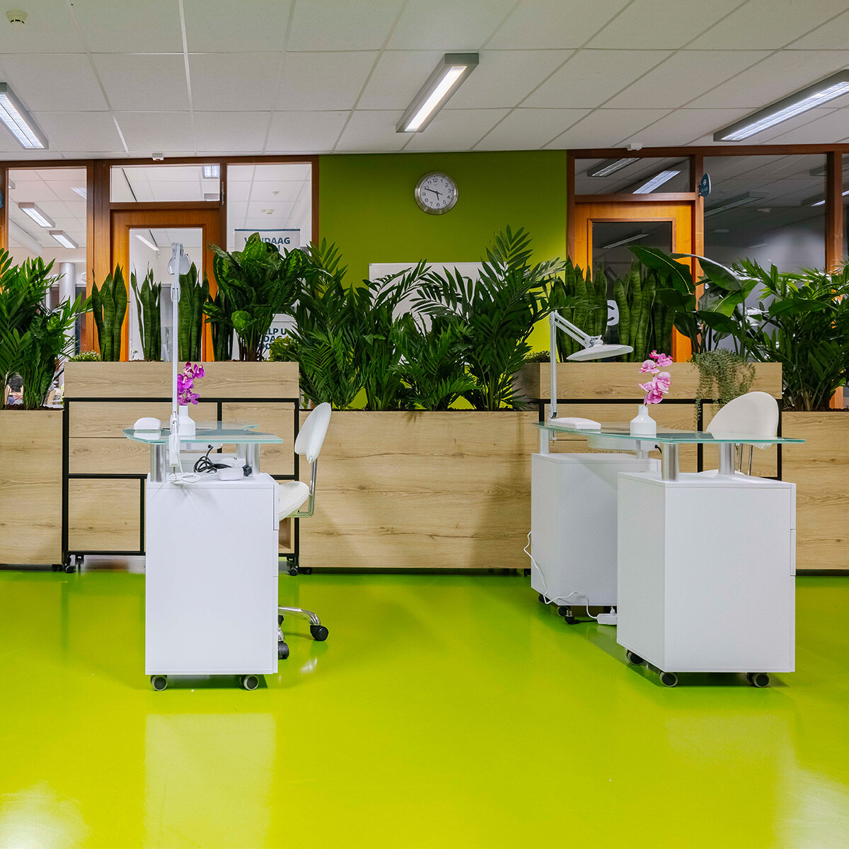 De vraag die wij per e-mail ontvingen was duidelijk; er was behoefte aan een extra afgeschermde praktijkruimte voor de nagelstylistenopleiding. Een verbouwing was geen optie en de ruimte moest ook grotendeels open blijven. Ze wilden planten, bergruimte én het moest flexibel en modulair zijn. Een hele wensenlijst, maar daar konden wij zeker wel wat mee! Ons Flexwall wandkastsysteem biedt namelijk geweldig veel mogelijkheden. Als (deels) open wandkast is het een decoratief pronkstuk voor iedere ruimte. Zoekt u vooral een praktische kast voor een meer opgeruimde ruimte, dan zijn er tal van lade- en kastdeurfrontjes beschikbaar. De kast biedt ook de mogelijkheid een plantenbak te integreren en wieltjes onder de kast te monteren. De Flexwall was dus zonder twijfel geschikt voor deze opdracht.