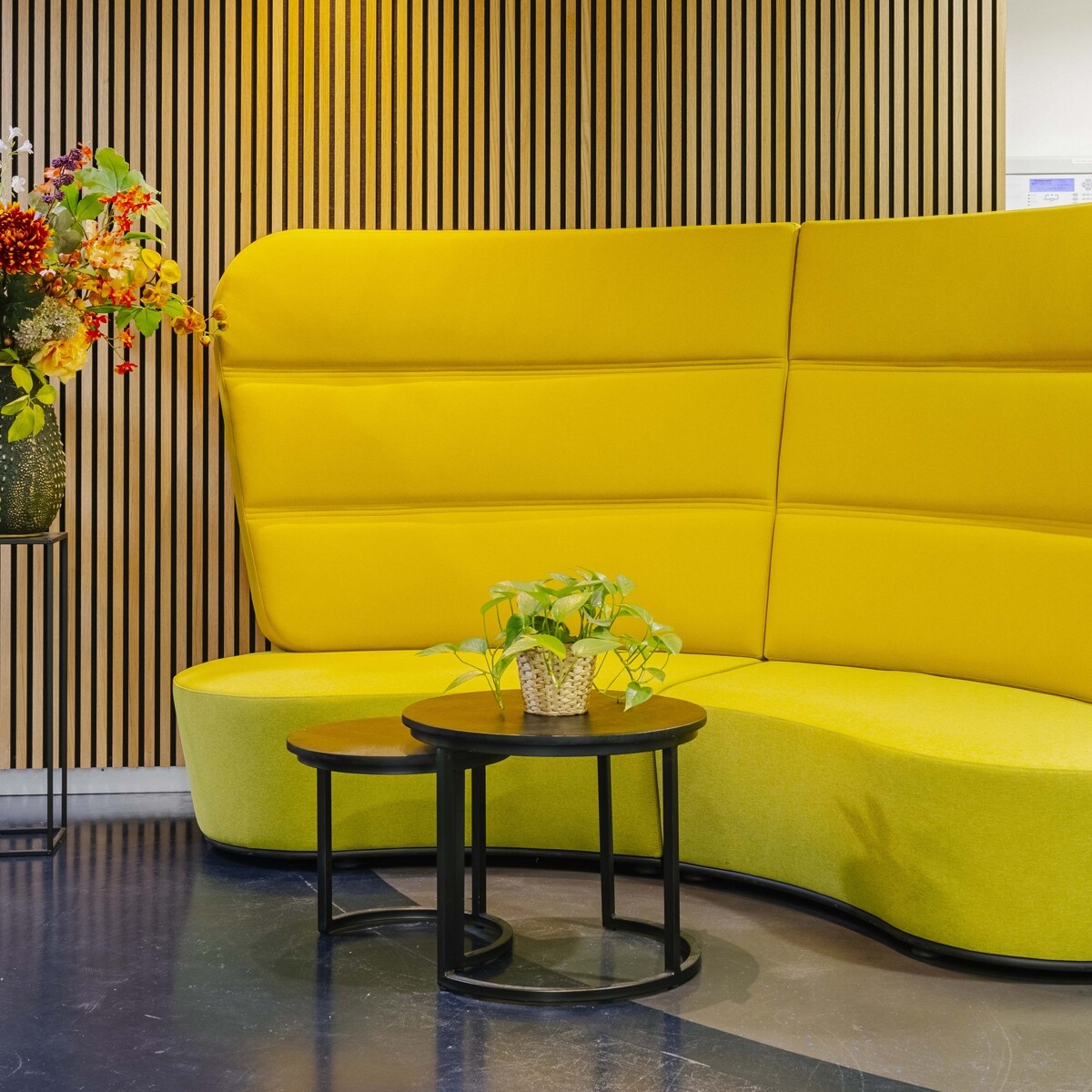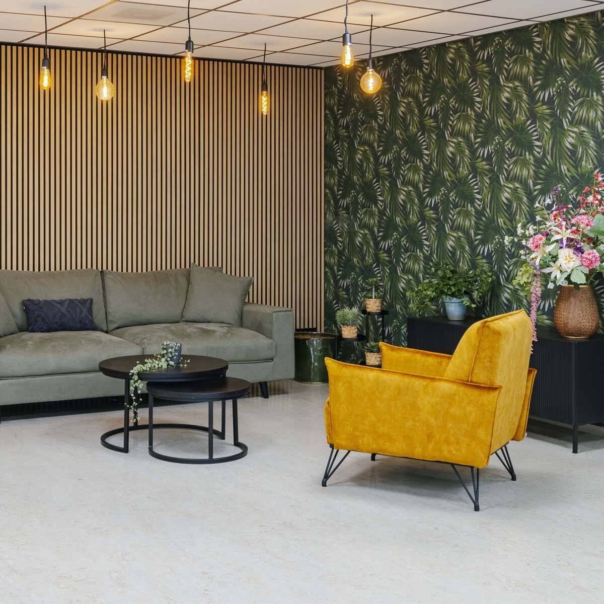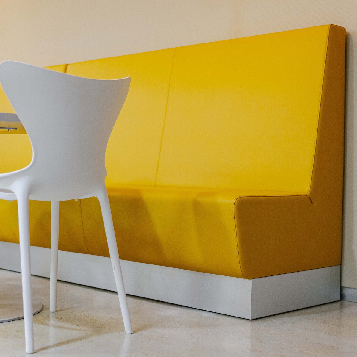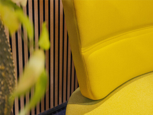 Ricky: "Sommige meubels waren al aanwezig, daar mochten wij nog wat aan toevoegen. Naast de tafels hebben we ook een knalgele treinzit-bank voorgesteld. Deze kon mooi tegen de lange wand en zou het interieur meer pit geven. Uiteraard is het ook een knipoog naar de zonne-energie. Om de klant wat vertrouwen in de combinatie te geven heb ik moodboards gemaakt van de stalen. Eventueel kunnen we ook altijd een 3D tekening maken. Dat was niet meer nodig, want de klant durfde het aan en bestelde er ook nog een eyecatcher bij voor de wachtruimte. Kijk, en daar krijg ik nu weer energie van!"