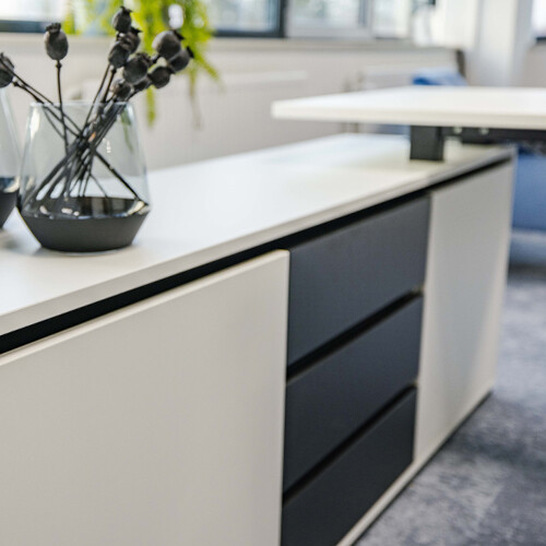 Een groot en ruim bureau met veel bergruimte zorgt ervoor dat u weinig overige kasten nodig heeft en een ruimtelijk gevoel houdt in uw kantoor.5. Comfortabele vergaderplek
